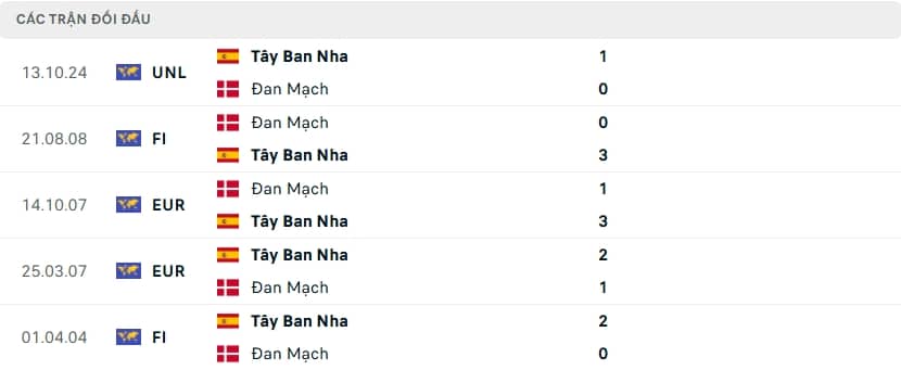 Thành tích đối đầu Đan Mạch vs Tây Ban Nha