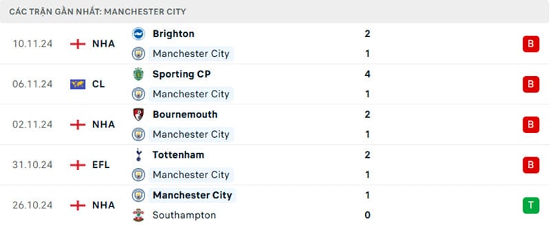 Manchester City hiện đang đứng thứ 2 trên bảng xếp hạng Premier League, với 5 điểm kém hơn Liverpool. Trong thời gian gần đây, đội bóng của Pep Guardiola đã trải qua một tháng đầy khó khăn, khi phải nhận 4 thất bại liên tiếp, tất cả đều diễn ra trên sân khách. Tuy nhiên, phong độ sân nhà của họ vẫn rất ấn tượng với 4 trận thắng liên tiếp tại Etihad, điều này cho thấy họ có thể tìm lại sự tự tin khi trở về tổ ấm.