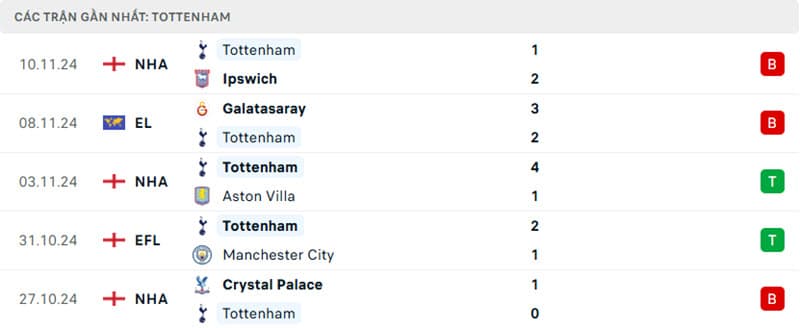 Tottenham đã để thua 3 trong 5 trận gần nhất, trong đó có các trận thua trước Galatasaray và Ipswich, cho thấy sự sa sút trong phong độ.